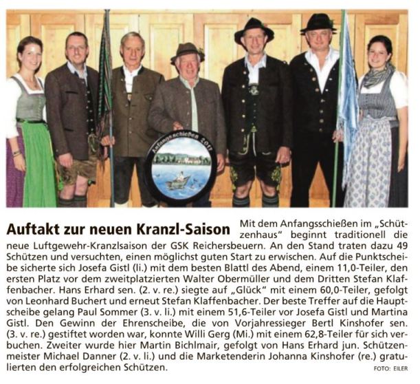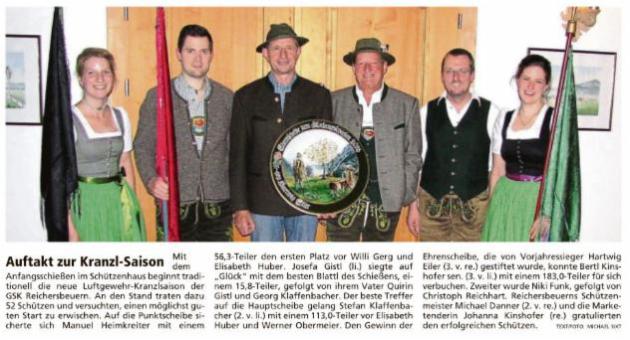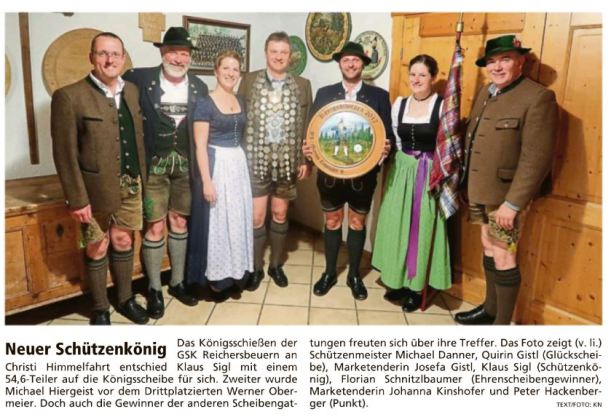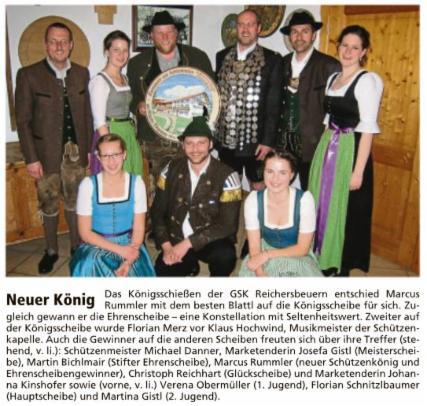 Königsschießen 2014 An Christi Himmelfahrt wird traditionell der neue Schützenkönig ausgeschossen. Dabei gab es bei 59 Teilnehmern immerhin 19 Blattl auf die Königsscheibe. Neuer König der GSK Reichersbeuern wurde mit einem 61,3 Teiler unser Fähnrich Markus Pirchmoser. Klaus Sigl belegte den 2. Platz auf die Königsscheibe. Bei der Jugend hatte Verena Obermüller das beste Blattl mit einem 46,6-Teiler. Die Ehrenscheibe, gestiftet vom Vorjahressieger und Musikmeister Klaus Hochwind, gewann Hans Erhart mit einem 88,0-Teiler. Mit einem 34,8-Teiler konnte Franz Wechselberger bei der Hauptscheibe den ersten Platz belegen. Auf die Meisterscheibe gelang ihm das zusätzlich mit einem 94,0-Teiler. Sieger auf die Glücksscheibe wurde Schützenmeister Michael Danner mit einem 19,4-Teiler. Bester Schütze auf die Punktscheibe war Herrmann Heimkreiter mit einem 51,4-Teiler.