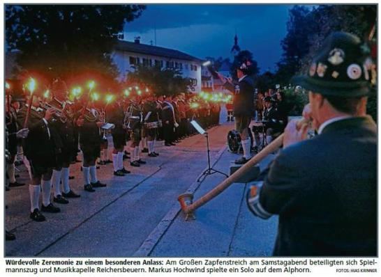 Zum Jubiläum der "Veteranen" vollzog die Schützenkapelle zusammen mit dem Spielmannszug einen großen Zapfenstreich am Samstagabend vor dem Kriegerdenkmal in Reichersbeuern. Im Licht der Fackeln