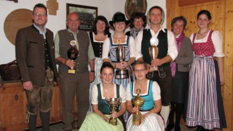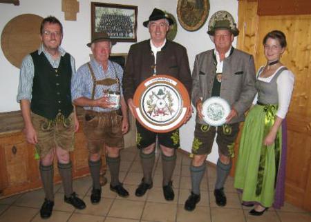 Bichlmair (Ehrenscheibe, 70,3-T.), Hans Erhard (Stifter Ehrenscheibe), Werner Obermeier (Meisterscheibe, 94 Ringe). vorne: Florian Reiter (Punktscheibe, 12,7-T.), Victoria Fichtner (Jugend,