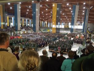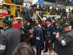 Patronatstag in Tölz am 03.05.2015 Eigentlich wollte man die kurze Anfahrt nach Tölz dazu nutzen, um noch vor dem Ausrücken nach 16 Jahren wieder einmal ein Kompaniefoto zu machen. Leider viel dieses Ansinnen aber regelrecht ins Wasser. Der strömende Regen am Morgen machte dieses Vorhaben zunichte. Man fuhr daher ohne Foto mit 2 RVO-Bussen und immerhin ca. 130 Mann nach Tölz zum Patronatstag. Die Tölzer hatten natürlich das gleiche Problem mit dem Wetter. So wurde Kirchenzug und Festzug von vornherein abgesagt und die Kompanien trafen sich gleich im Tölzer Eisstadion, der Hacker-Pschorr-Arena. Das Stadion war wunderbar hergerichtet und lies ein Bierzelt nicht vermissen. Nach der Begrüßung der gut 3000 Schützen aller anwesenden 47 Gebirgsschützenkompanien durch Landeshauptmann Karl Steininger, hielt der Tölzer Stadtpfarrer Peter Demmelmair den Festgottesdienst. Anschließend fand die Ehrung langjähriger aktiver Schützen statt. Von unserer Kompanie waren dies für 60 Jahre Franz Ableitner, Georg Bichlmair und Ludwig Frauenrieder, sowie in Abwesenheit für 50 Jahre, Ewald Hentschel.
