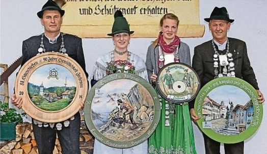 Hauptmann Josef Schlickenrieder und den Schützenliesln Johanna Kinshofer und Franziska Bernöcker vor. Mit dem Kompanietaler in Silber wurden Schütze Johann Bichlmair, Zeugwart Lorenz Kirmair und