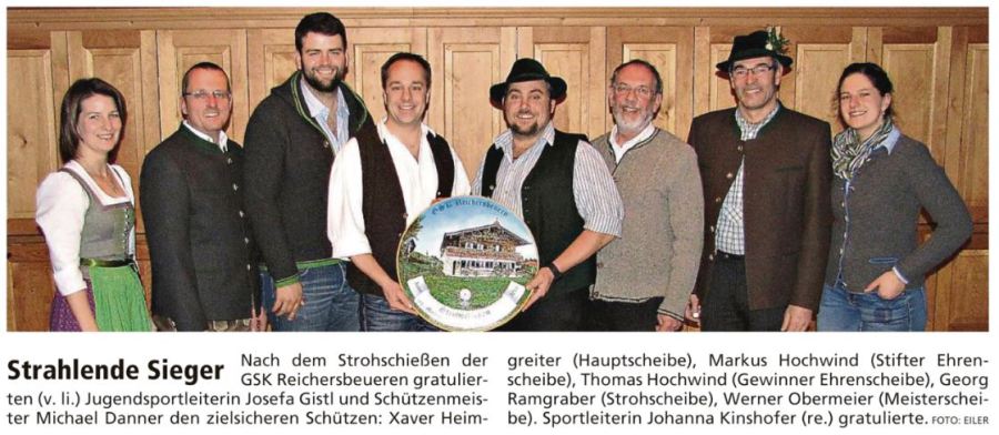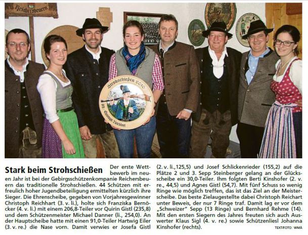 Strohschießen am 01.01.2014 Traditionell wird am ersten Tag des Jahres ein Strohschießen im Schützenhaus ausgerichtet. Leider traten heuer nur 41 Schützen an den Stand. Im Vorjahr waren es immerhin 10 Personen mehr. Wer nicht antrat versäumte jedenfalls einen griabigen Abend, bei Rehragout und einem Faßl Freibier. Gespendet wurde das Rehfleisch von den örtlichen Jagdpächtern und das Bier vom Schützenmeisteramt. Die Ehrenscheibe konnte Josefa Gistl (3.v.li.) gewinnen, welche Ihr vom Vorjahressieger und somit Stifter Peter Hackenberger (2.v.li.) überreicht wurde. Michael Malterer (li.) gewann die Haupt- und Klaus Walter (nicht mit auf dem Bild) die Glückscheibe. Sieger bei den Ringen wurde Michael Förg (3.v. re.) und auf die Strohscheibe hatte Johanna Kinshofer (2.v.re.) das beste Ergebnis. Schützenmeister Michael Danner (re.) gratulierte dazu den Siegern recht herzlich.