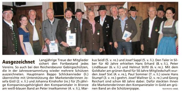 Jahrtag und Schützenball 2014 Mit einem Kirchenzug, begleitet von Klängen der Schützenkapelle und des Spielmannszuges, beging man den Jahrtag der Gebirgsschützenkompanie Reichersbeuern. Die heilige Messe in der Pfarrkirche St. Korbinian hielt Dekan Ludwig Scheiel. In seiner eindringlichen Predigt ging er auf den ursprünglichen Auftrag der Gebirgsschützen ein: In höchst unsicheren Zeiten das Allerheiligste mit Waffen vor Feinden zu beschützen. Dieser Auftrag hat sich im Laufe der Zeit gewandelt. Die Gebirgsschützen stehen heutzutage vor allem mit Ihrem Verhalten für den Schutz des Glaubens und den Erhalt von Brauchtum und Tradition ein. Und ein jeder Schütz´ sollte sich ab und zu prüfen, ob er diesem Auftrag auch gerecht wird, so Scheiel. Zum Ende der Messe dankte der Dekan der ganzen Kompanie für die Begleitung an Fronleichnam und für die Teilnahme am dörflichen Leben. „Ihr macht´s das Dorf mit zu dem, was es ist.“ Nach der Messe marschierten die Schützen unter Kanonensalven zum Kriegerdenkmal. Hier lies 1. Vorstand Josef Forster einen Kranz zum Gedenken an die Gefallenen der beiden Weltkriege und an die verstorbenen Schützenkameraden niederlegen. Danach rückte die Kompanie in den Altwirt-Saal zum Schützenball ein. Der feierliche Rahmen des Balles wurde dazu genutzt, um verdiente Schützen zu Ehren. Die Ehrung wurde vom anwesenden Landeshauptmann der Bayerischen Gebirgsschützenkompanien, Karl Steininger, vorgenommen. Unterstützt wurde er dabei von Hauptmann Josef Schlickenrieder und den Marketenderinnen. Geehrt wurden für besondere Verdienste: Martin Melf und Walter Obermüller mit dem Kompanietaler in Silber am weiß-dunkelblauen Band. Michael Danner und Michael Sixt mit dem Bundestaler in Bronze am blauen Band, sowie Dieter Brockmann und Hans Erhard mit dem Bundestaler in Silber am blauen Band.