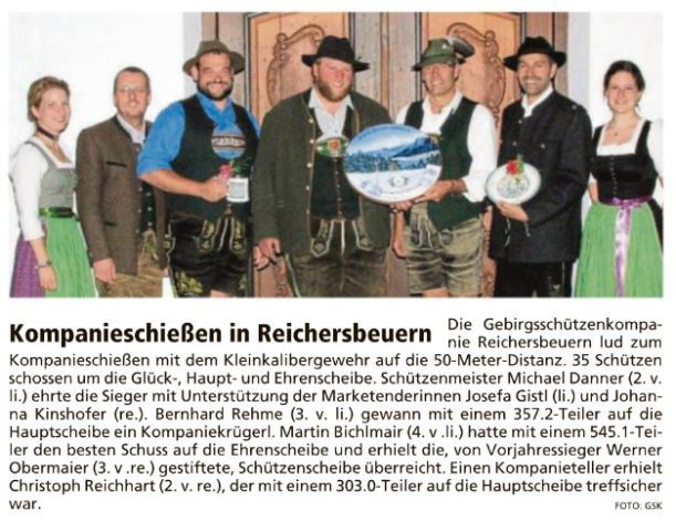 Kompanieschießen 2014 nur 31 Schützen traten heuer mit dem Kleinkaliber an den 50-Meter-Stand, um sich zu messen. Mit einem 513,6-Teiler gewann Martin Öttl die von Vorjahressieger Martin Melf gestiftete Ehrenscheibe beim Kompanieschießen 2014. Zweiter wurde Quirin Gistl vor Michael Hiergeist. Auf die Hauptscheibe hatte Hermann Heimkreiter mit einem 59,4-Teiler den besten Schuss und zugleich das beste Blattl des Wettbewerbs. Walter Obermüller wurde hier Zweiter und Johanna Kinshofer Dritte. Gewinner auf die Glückscheibe konnte Peter Hackenberger vor Fritz Langeder und Gerhard Rehme werden. Bei einer griabigen Brotzeit wurden die Gewinner im Stüberl des Schützenhauses gefeiert.